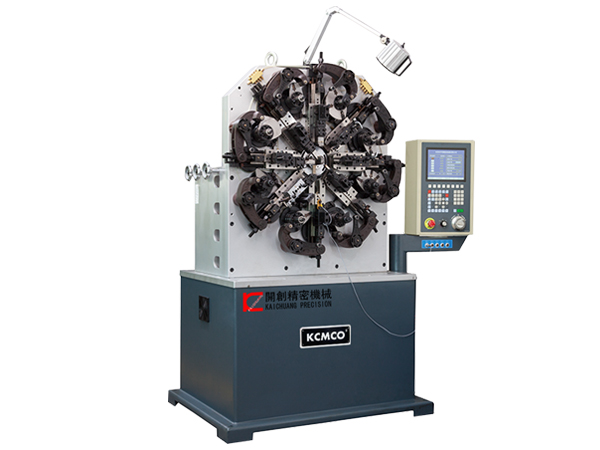 開創KCT-35W三/四軸數控萬能彈簧成型機采用臺灣(益圖)控制系統、引用日本三洋(Sanyo Servo Motor)伺服電機和高精密軸承等構成,該機型一共有四軸,分別為凸輪軸、送線軸、轉芯軸和卷曲軸(另訂配),系統透過CNC程式碼,分別對送線與凸輪傳動系統做同步控制,可達到24小時精確運轉。此外,由于我司彈簧機設備均采用高精度的伺服馬達及電腦控制,因此結合伺服卷曲一軸,即可輕松地生產尺寸精密且角度復雜的彈簧產品。
